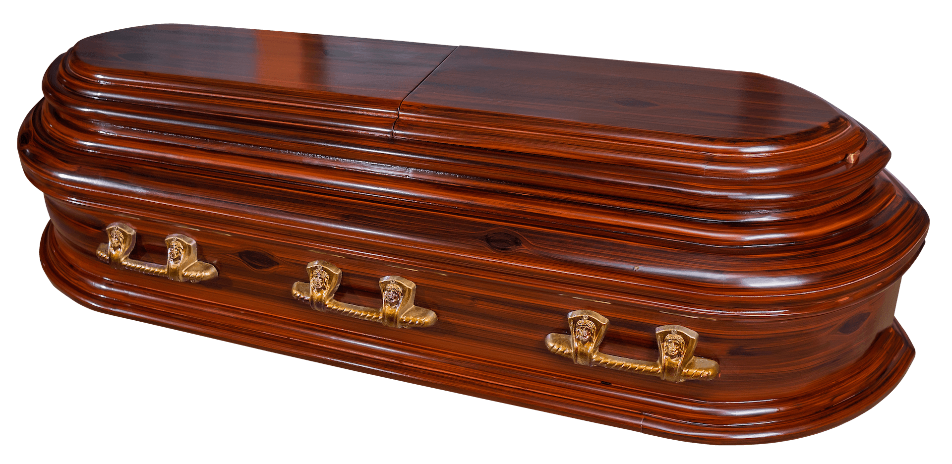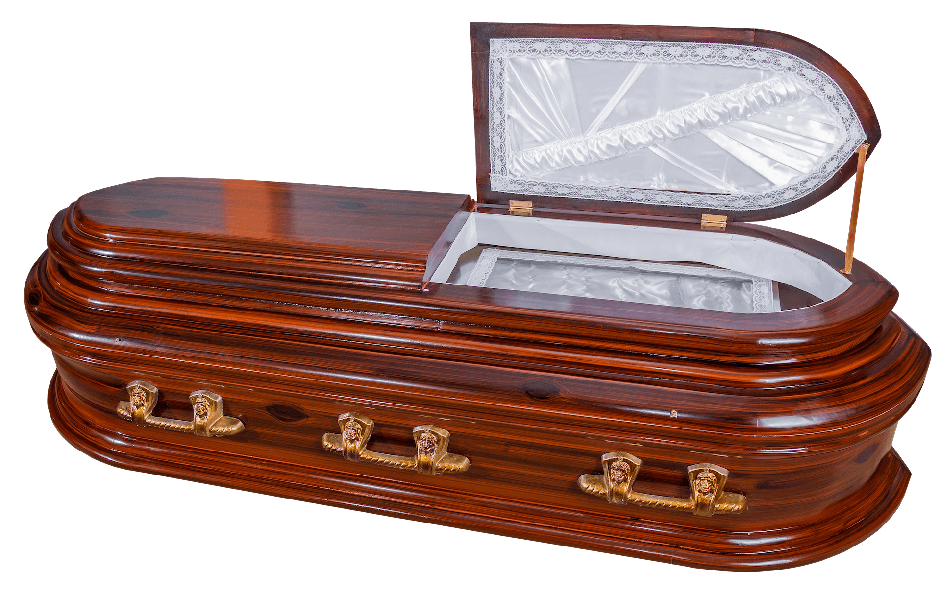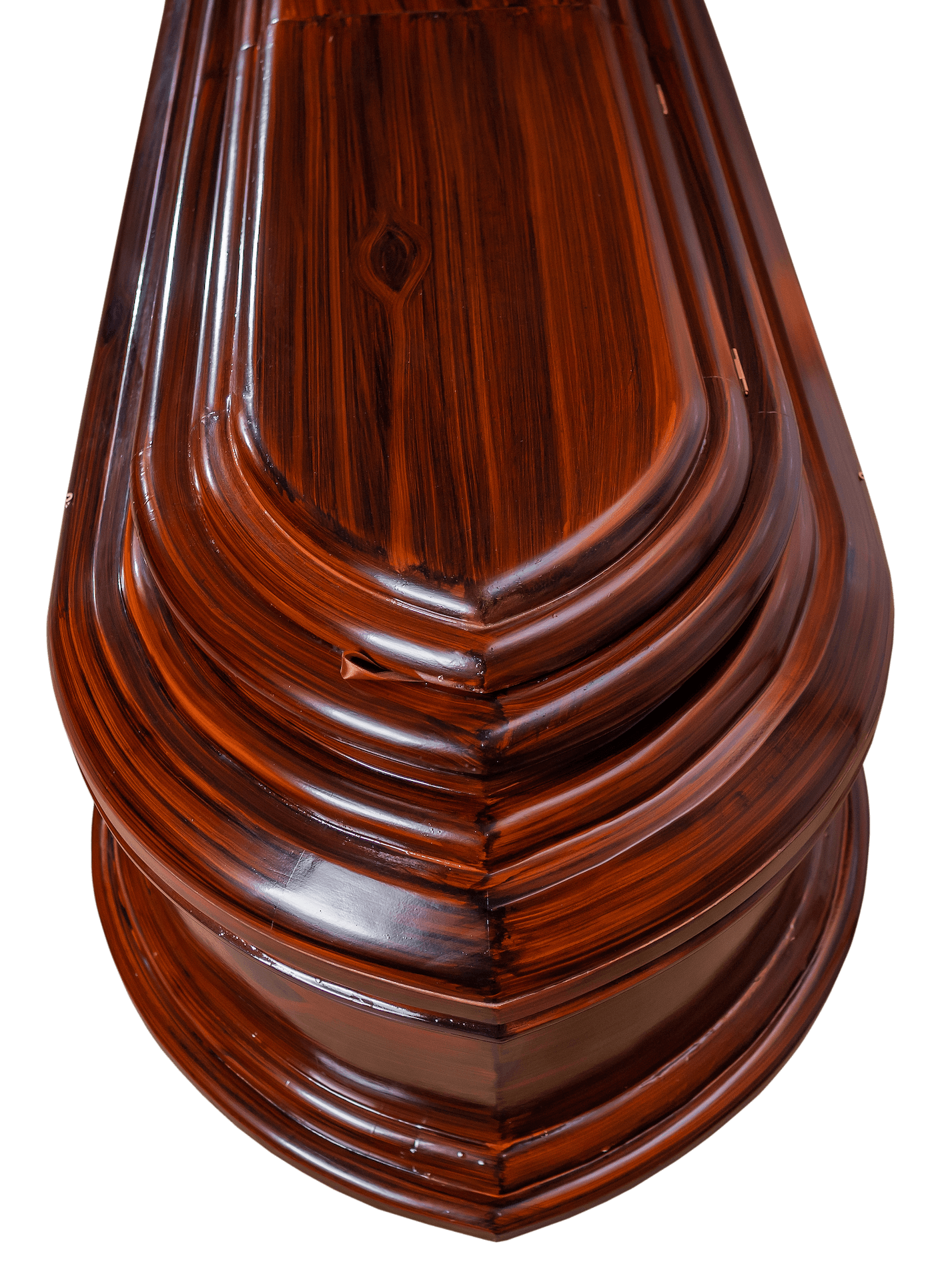 Féretro de madera alta gama con lineas redondeadas, confección en madera ochoo nativa boliviana, confeccionado de manera 100 % artesanal, manillas de acero con motivos tallados.