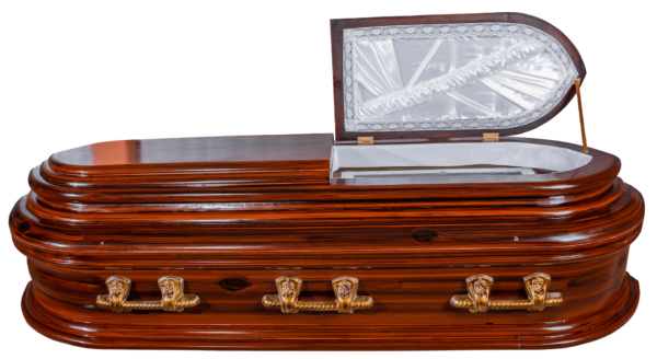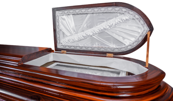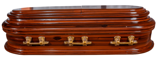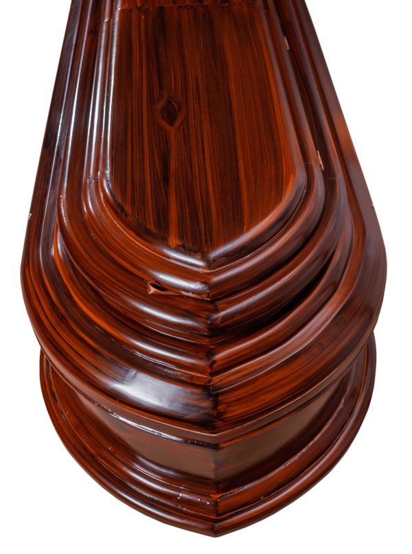 Féretro de madera alta gama con lineas redondeadas, confección en madera ochoo nativa boliviana, confeccionado de manera 100 % artesanal, manillas de acero con motivos tallados.