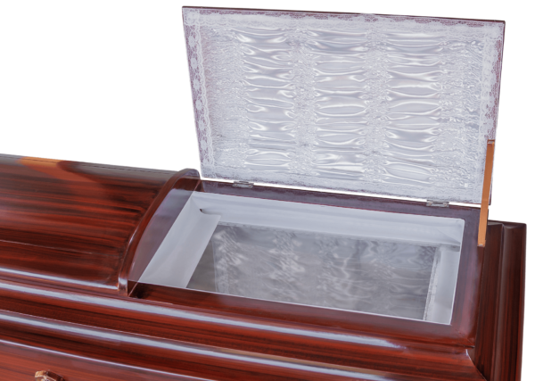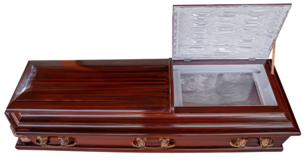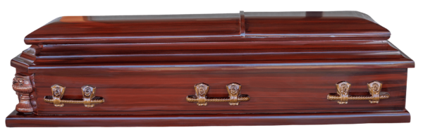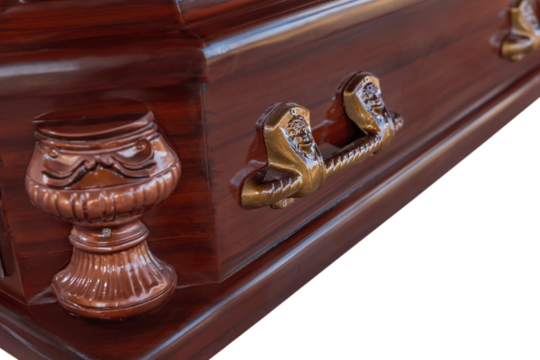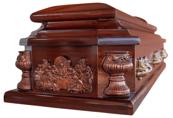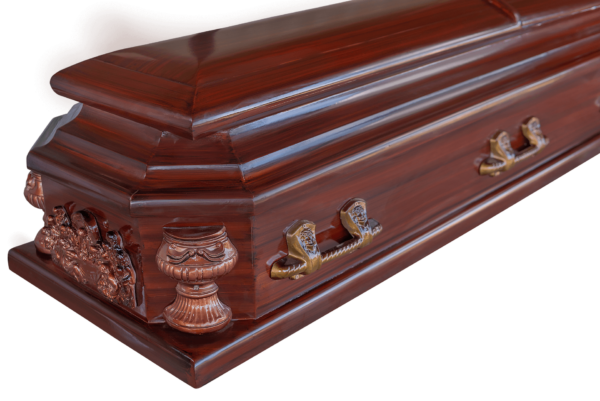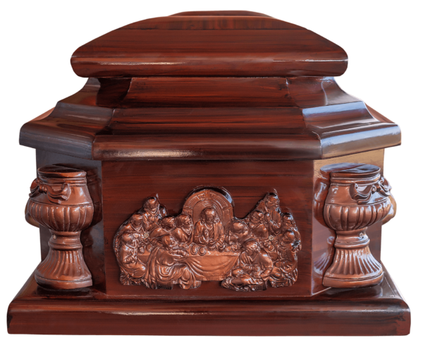 Féretro de madera alta gama caja cuadrada con cortes refinados en su parte superior, confección en madera ochoo nativa boliviana, confeccionado de manera 100 % artesanal, manillas de acero con motivos tallados y detalles decorativos con motivos religiosos.